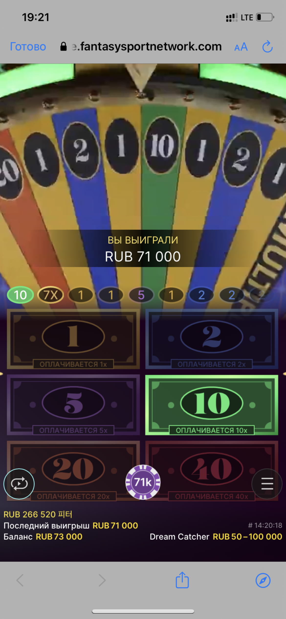 Зашел я тогда в один из своих любимых лайвов Dreamcatcher. Решил поставить шальной касарь на х10. Диллер раскрутил барабан и вижу как падает мультиплеер х7. Я понимаю что скорее всего сейчас выпадет очередная 1 или2, но вопреки всем ожиданиям выпала 10. В итоге я сразу решил вывести 70к
