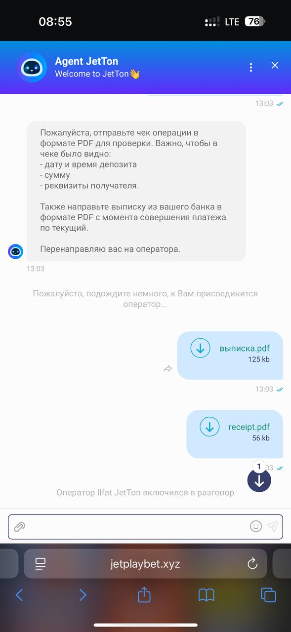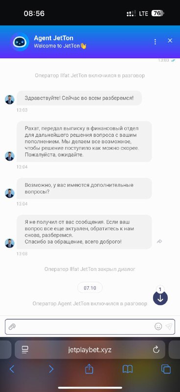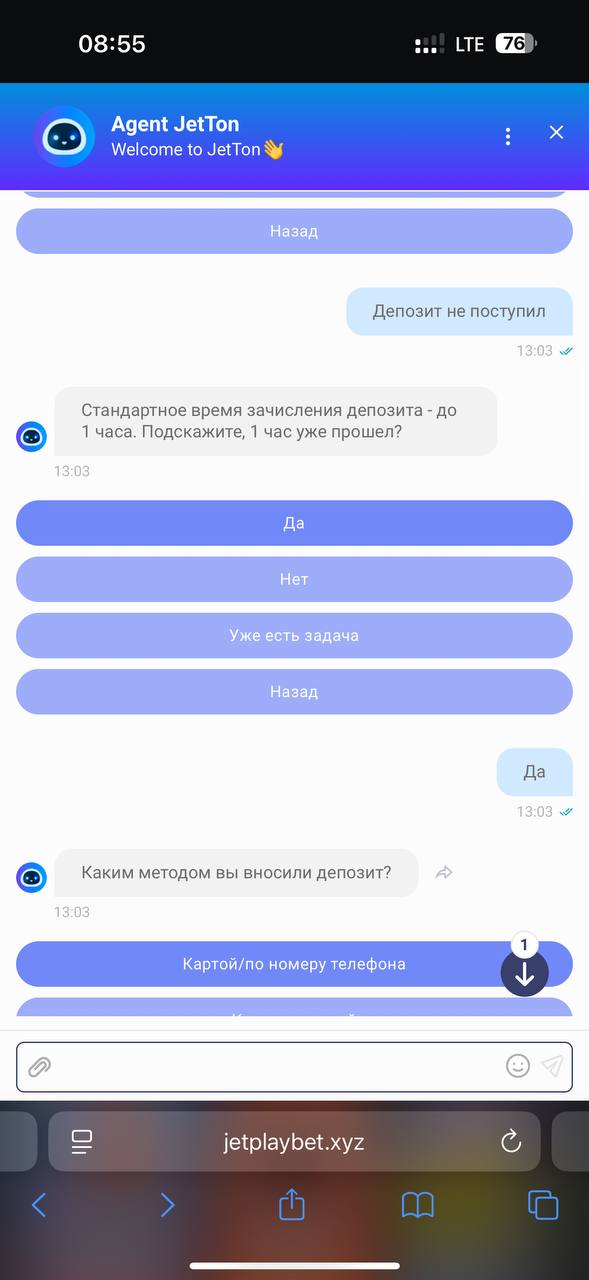 Это ещё хорошо, что я VIP-игрок на JetTon Games, и у меня есть VIP-менеджер! Иначе я, похоже, вообще бы не получил свой депозит. Но всё равно каждый раз приходится сначала писать в поддержку, а потом уже своему менеджеру.