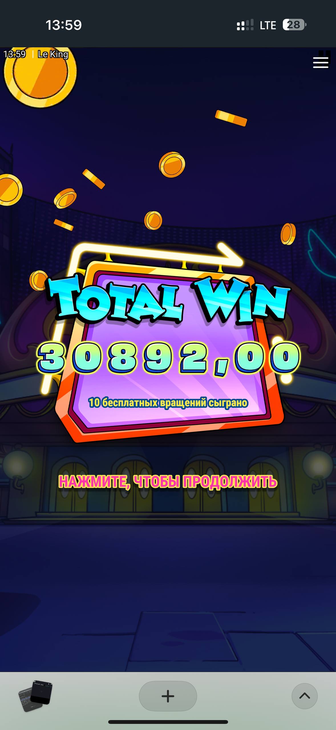 Всем привет! Фараон не смог, и в мою голову пришла гениальная мысль. А вдруг ле Кинг сможет дать много. Это была какая-то чуйка, и да, я не ошибся. Зайдя в слот, я не раздумывая взял топовую бонуску за 8 000. Сразу начало играть, и вторым спином разыграло всё поле, что не могло не обрадовать меня. К моему счастью, он поставил 3 радуги на последних трёх спинах, которые давали по 10k за спин. Улыбка не слезала с моего лица, и итоговый выигрыш с бонуски составил 30k рублей. Надеюсь, всем будут падать только такие бонусы)!