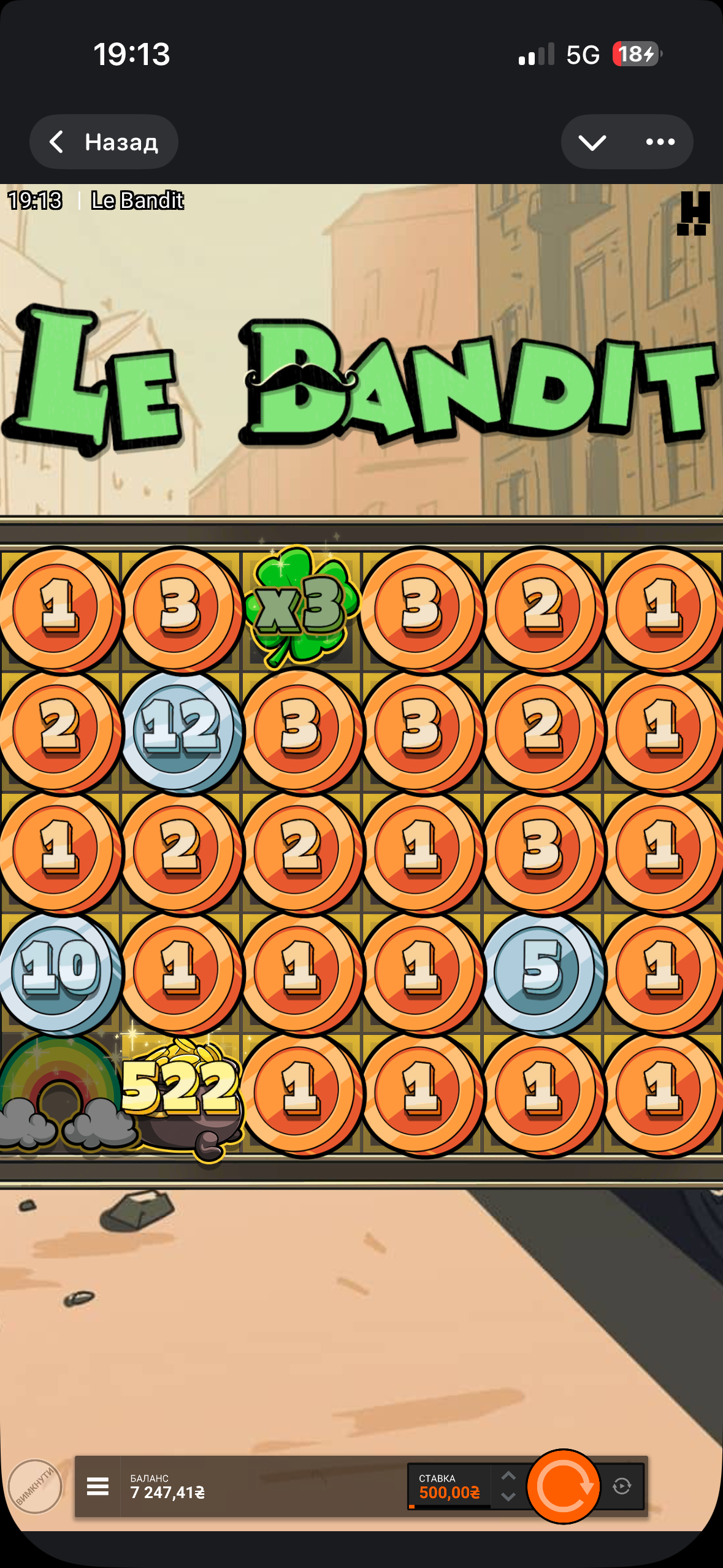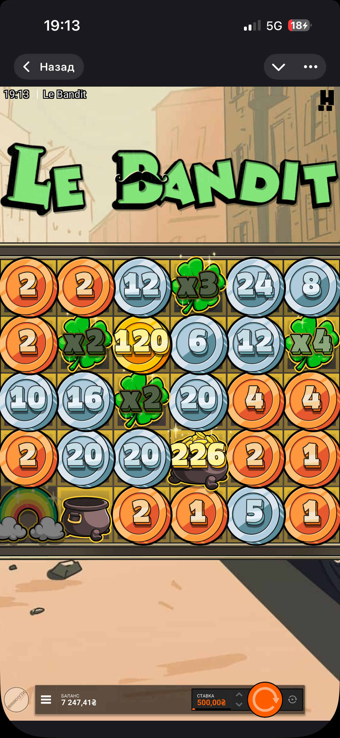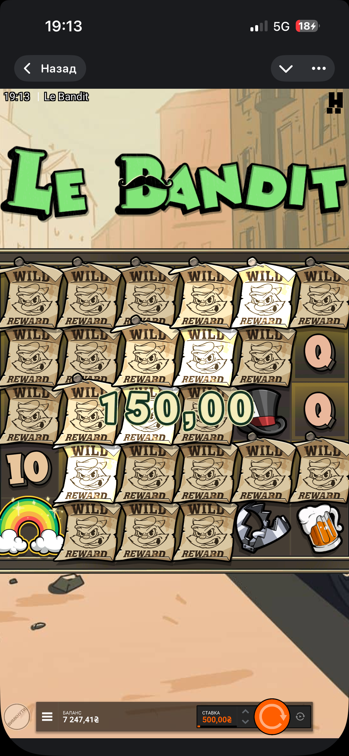 Играл в ле бандита, сначала ловил бонуску, потом решил покрутить функции с радугами, и через пару спинов удалось поймать такую поляну вилдов: