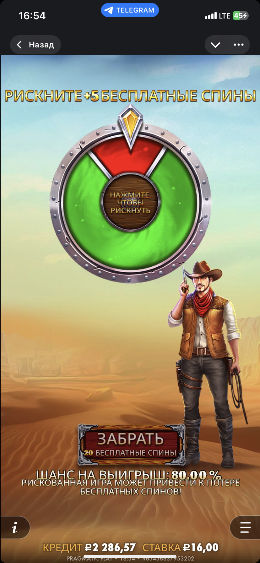 Я купил бонуску в слоте Mustang Gold Megaways, и там можно ее пробить. Чем больше раз рискнул — тем больше спинов будет. Риск состоит из колёсика с зелёной и красной половинами, и вот, у меня получилось 3 раза поймать зелёную, и остался решающий спин. В итоге, естественно, это было зря — не смог добить максималку спинов и выпало красное. Вы верите в честность риска в таких слотах?