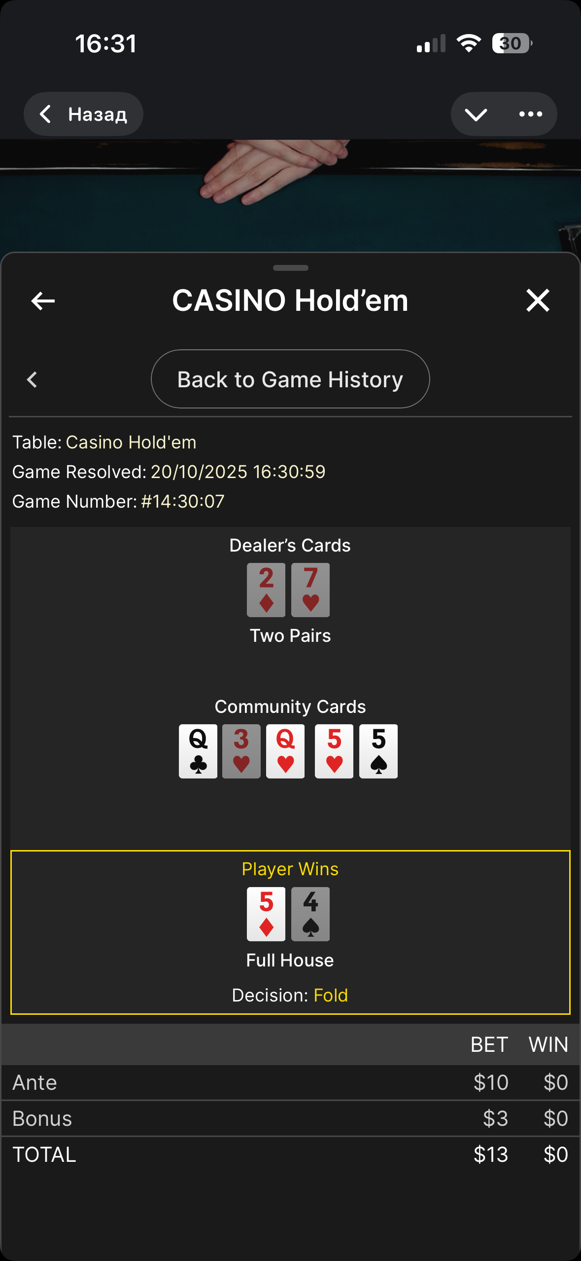 Сделал ставку 10 $ на анте и 3 $ на бонус. Мне раздали 5 и 4, на флопе вышли две дамы и тройка. Но я этого даже не увидел — сразу после ставки игра зависла. Экран просто не грузился, я ничего не видел и не мог сделать абсолютно никаких действий. Оставалось только ждать и надеяться, что за пару секунд всё отлагает и я увижу карты.