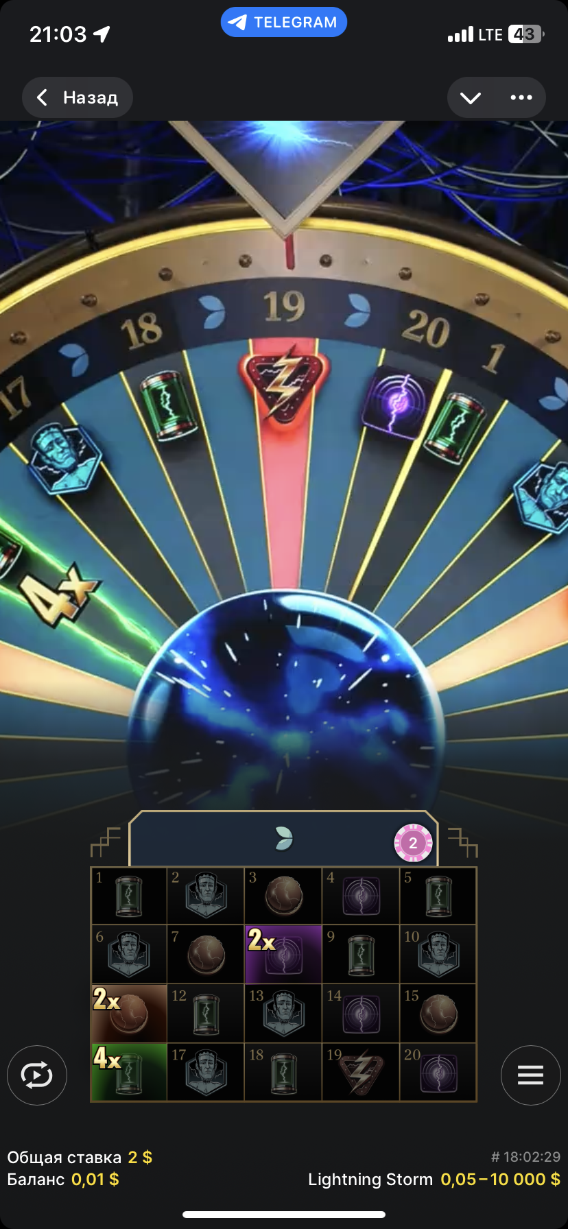 Короче, захотел повторить успех и поймать линию листочков, поставил на него текущий баланс и стал ждать. Но вместо листочка, неожиданно, падает лучший и топовый бонус на колесе — сам Lightning Storm.