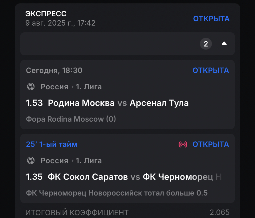 9 августа я составил спортивный экспресс из двух событий в футболе: ФК Сокол Саратов VS ФК Черноморец и Родина Москва VS Арсенал Тула. От Черноморца мне нужен был всего один гол, с чем они прекрасно справились в первом же тайме. А вот последний матч знатно пощекотал нервишки…