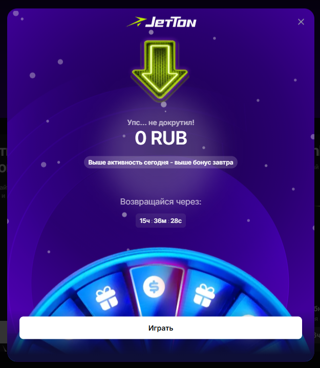 Всем общий привет, господа, недавно на джеттоне появилась новая функция — колесо. Я видел это колесо раньше для новых аккаунтов, но сейчас его добавили на ежедневный прокрут, и не особо понятно, как там что-то выиграть. Написано что-то на уровне «слей много денег, завтра вернем часть», но не знаю, насколько это правда. Пока что и я, и кент по 2 раза прокрутили и увидели ровно 0 рублей, но на форуме я видел и скриншот с выигрышем целых 140 рублей) Поживем, увидим, вообщем, что оно из себя представляет!