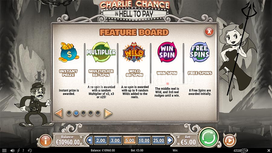 Мы видим многофункциональный вайлд, респины с множителем, фриспины и случайные мгновенные выплаты. Когда начинется бонусный раунд, игрок убедится, что Дьяволица не так уж и плоха. Чем больше огоньков на барабанах, тем ярче пламя в ее руках и шагов для Чарли среди россыпи особых функций. Все они добавляются один к другому и вместе начинают составлять действительно горячие и взрывоопасные супербольшие выигрышные линии.