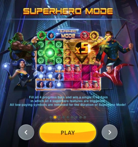 Что же касается непосредственно игры, выход которой запланирован на 20 мая 2020, то игрок увидит, как каждый спин 42 символа выпадают на 7 колонках и 6 рядах, находящихся на фоне небоскребов. Для зачета приза необходимо собирать кластеры от 5 и более одинаковых изображений. Среди них и будут выпадать символы с героями. В верхней части слота находятся взаимосвязанные с каждым из них четыре индикатора.