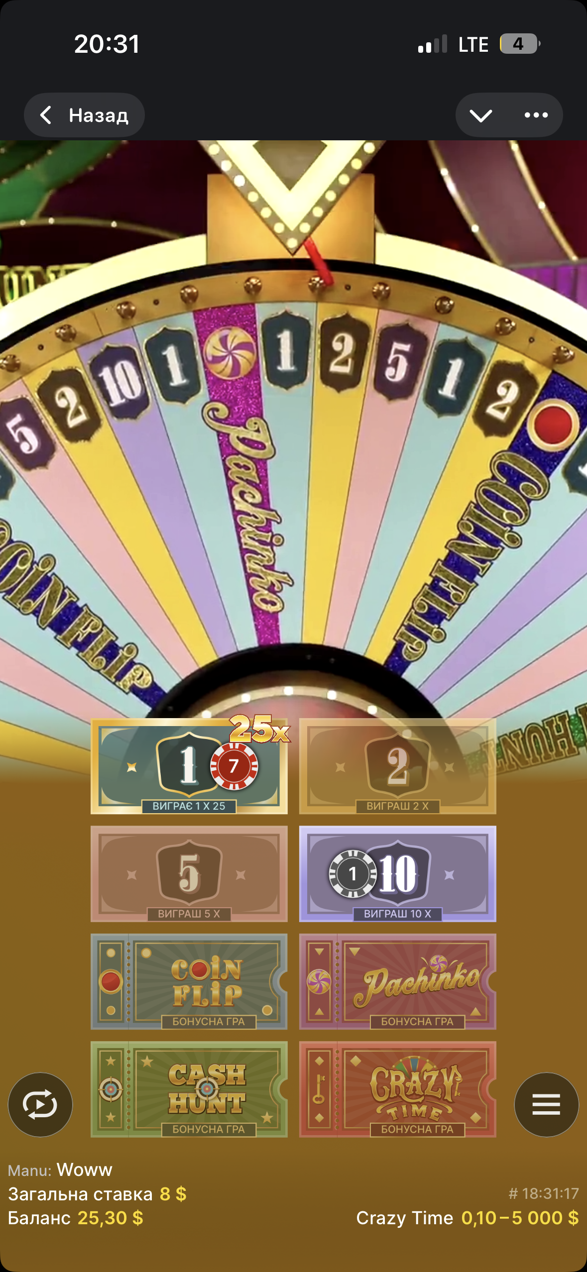 Забрал промокод и зашел в crazy time, решил поставить 7$ на 1 и 1$ на 10. Выпало умножение 25х на 1, крутилось идеально, и казалось бы, должно докатиться до 1, но буквально чуть чуть не хватило. А ведь мог бы быть легкий выигрыш 180$ с промокода, такое не часто ловишь…