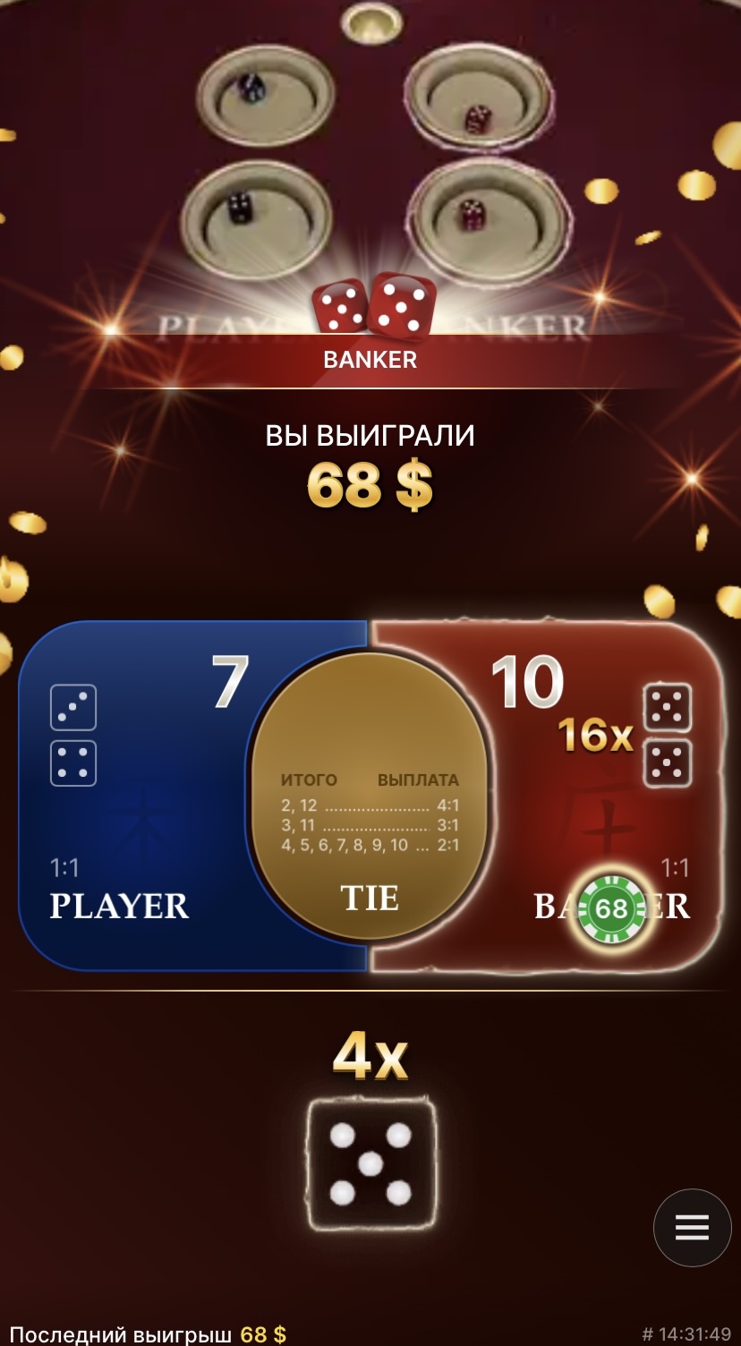 В моем случае это было пять, за которое давался дополнительный икс 4х сверху. Я поймал сначала одно пять, а затем и второе в придачу, и они перемножились друг на друга, также будучи высшей суммой против player, что сделало выплату за выигрыш очень яркой и захватывающей. Очень хороший режим!