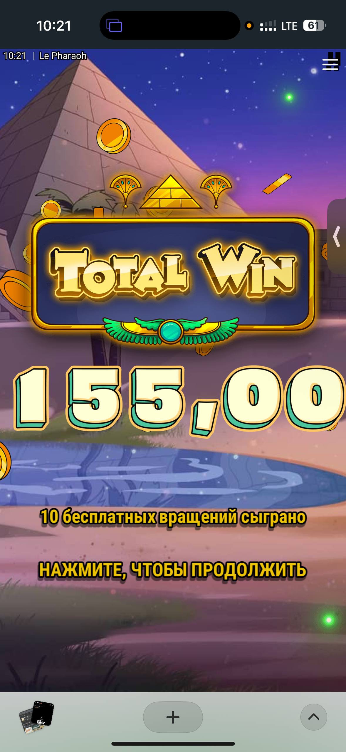 После своих удачных бонусных покупок я решил пойти ещё к своему одному другу Le Pharaonу. Купил также топовую бонуску и выбрал левую (мне как-то вообще не нравится правая, не люблю эту механику, где падают монеты). 11 из 12 спинов не было ни одной сыгровки, и только на последнем спине разыграло 3 поля и выпала гарантированная радуга. Бонуска дала 150 рублей.