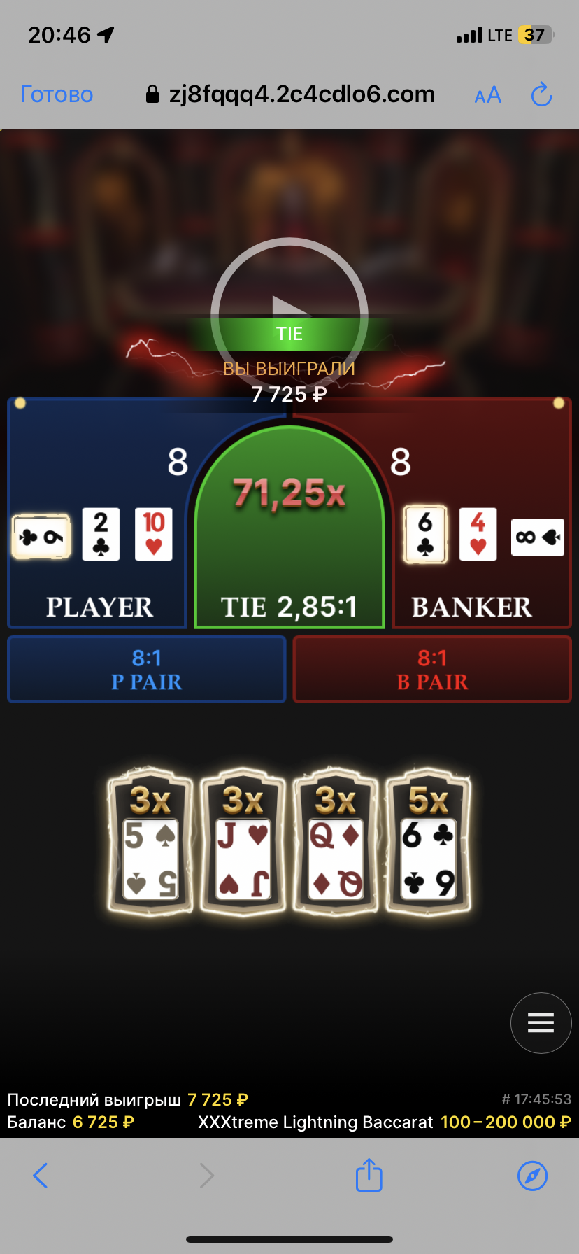 В очередном блиц раунде за карты 6 крести присваивались дополнительные множители 3 и 5х. Они достались и плееру, и банкиру, и каким-то чудом у них получилась из этого ничья. Икс суммировался, и выплата за ничью составила целых 71,25х!