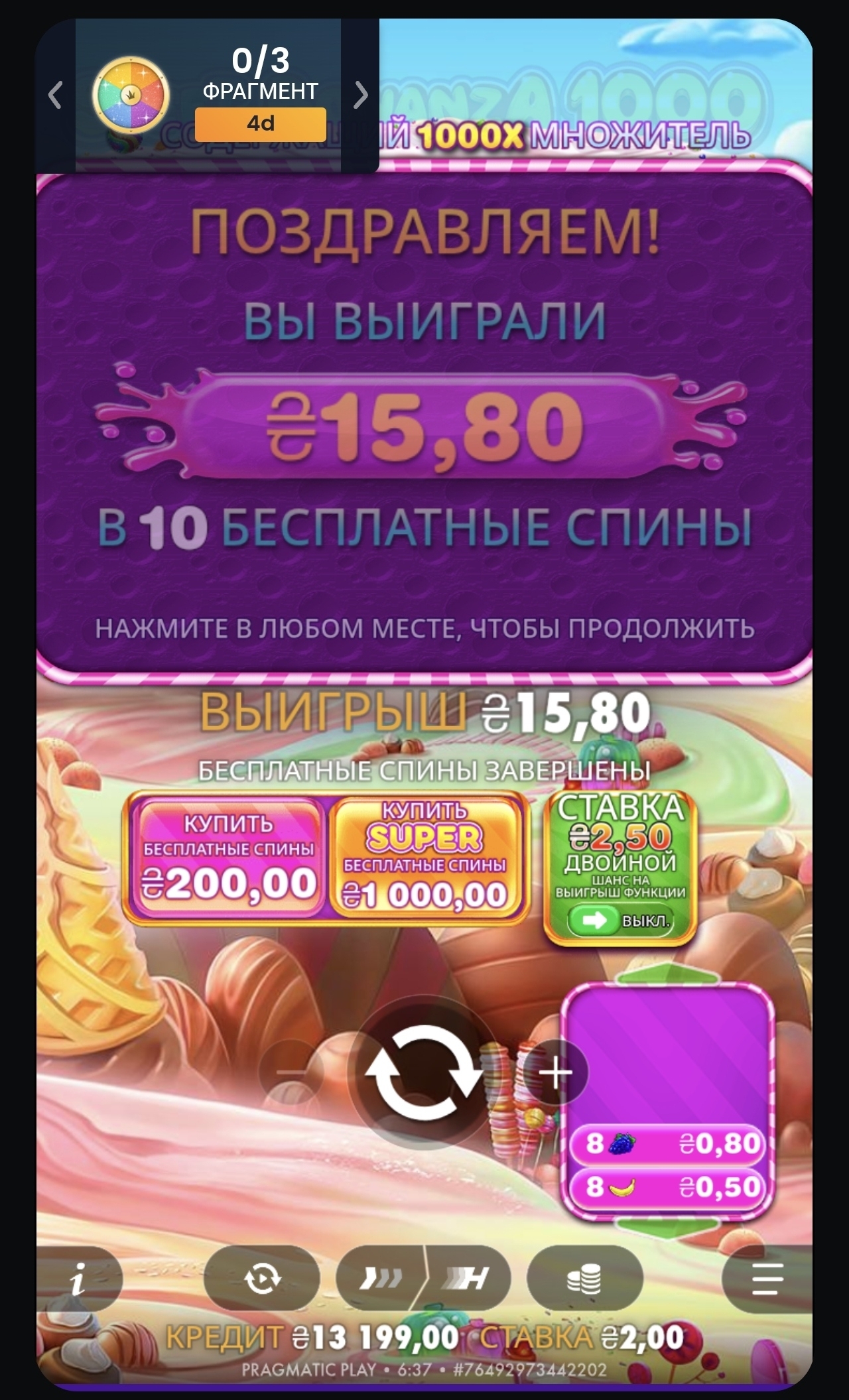 Бонанза как не играла в обычных спинах, так и не играет в покупных топовых бонусках. Давно не заходила туда и вот решилась купить бонуски с шансом выпадения 1000х бомбы. Результат на скринах, не играло даже на 20 х бомбе, давно уже бонанза не та. Что выбить бонуску невозможно, что покупная даёт пару иксов. Слот стал не для игры, а выкачка депозита.