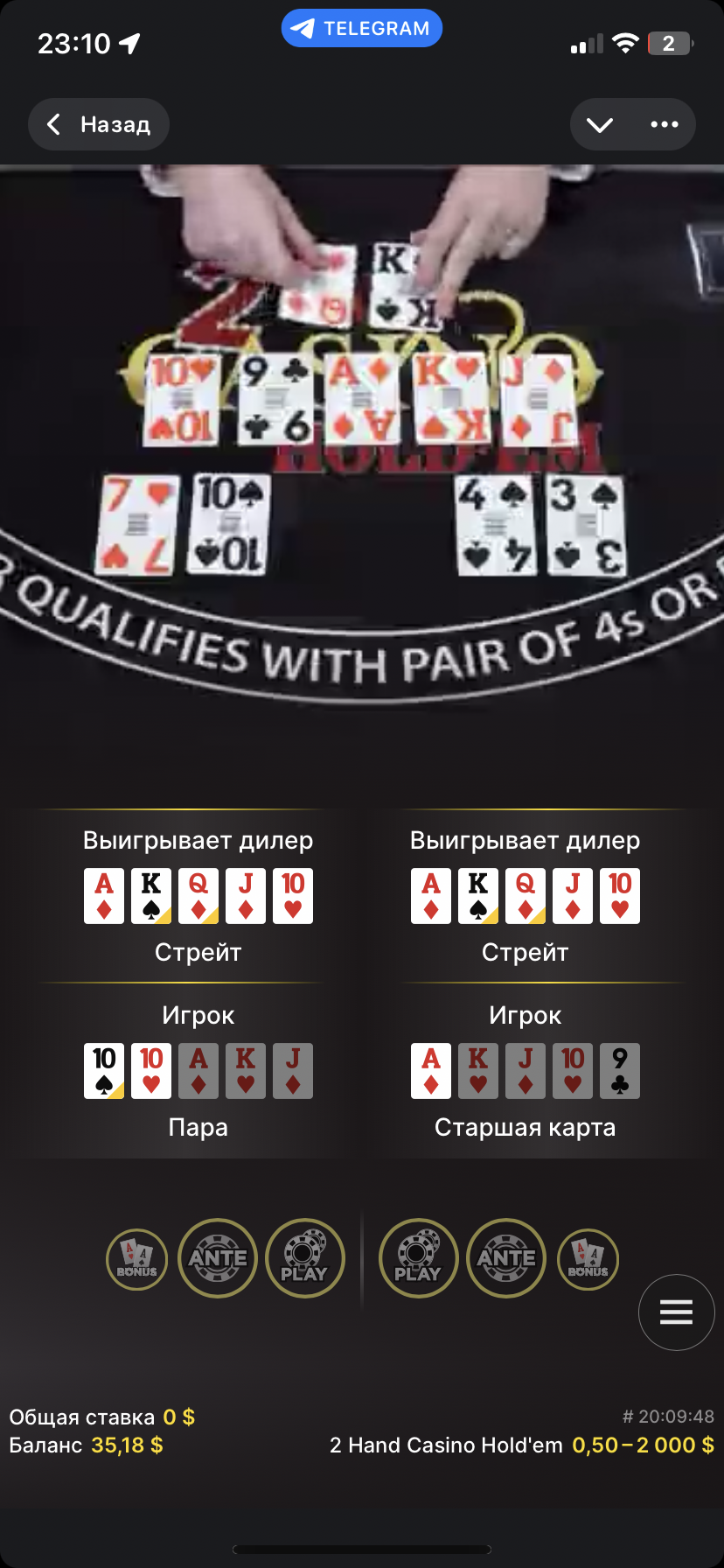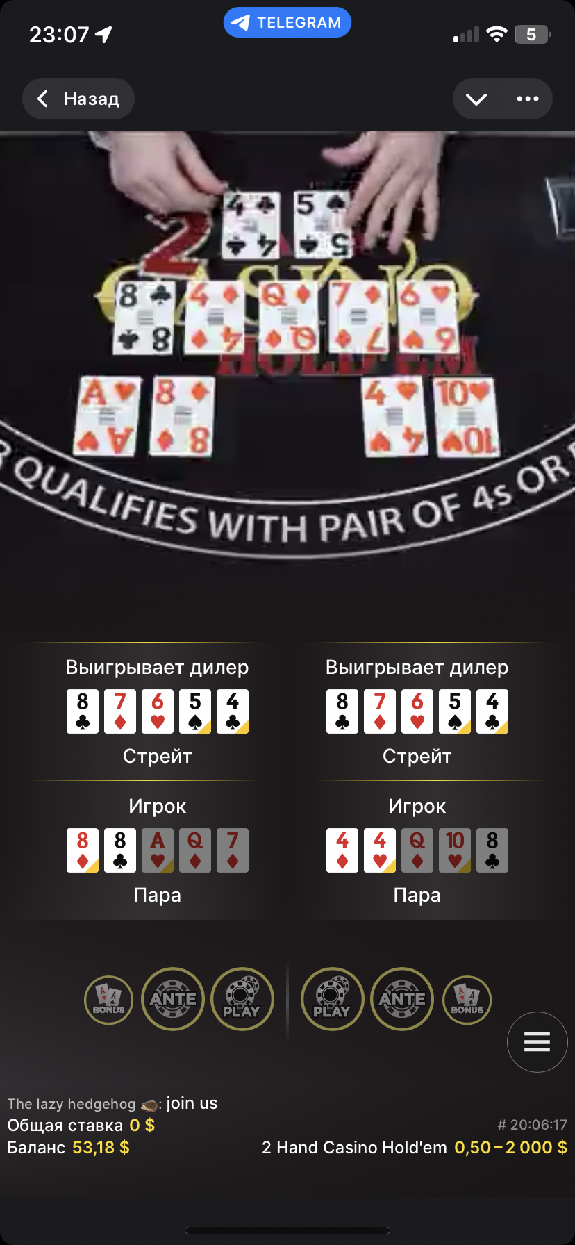 Я уже показывал версию Casino Holdem, где идёт игра в покер против казино, но только у игрока две руки, а не одна. Хоть здесь и больше возможностей для выигрышных комбинаций со стороны игрока, у дилера постоянно каким-то чудесным образом закрывается стрит с картами на столе, да и в принципе любые комбинации другие тоже. Удивительно на самом деле, как это работает в сторону дилера, если у него по-прежнему одна рука, а у нас две, но мы всё равно проигрываем