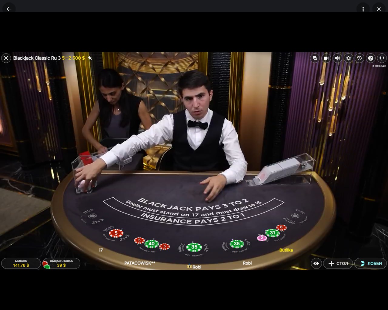 Я рад, что принял такое решение, ведь дилер раздал себе 9, мне же 10 и J (Валет). Но блин, если бы ещё десятка моя была тоже той масти, что и «перввые» две карту — бонус был бы 240$.