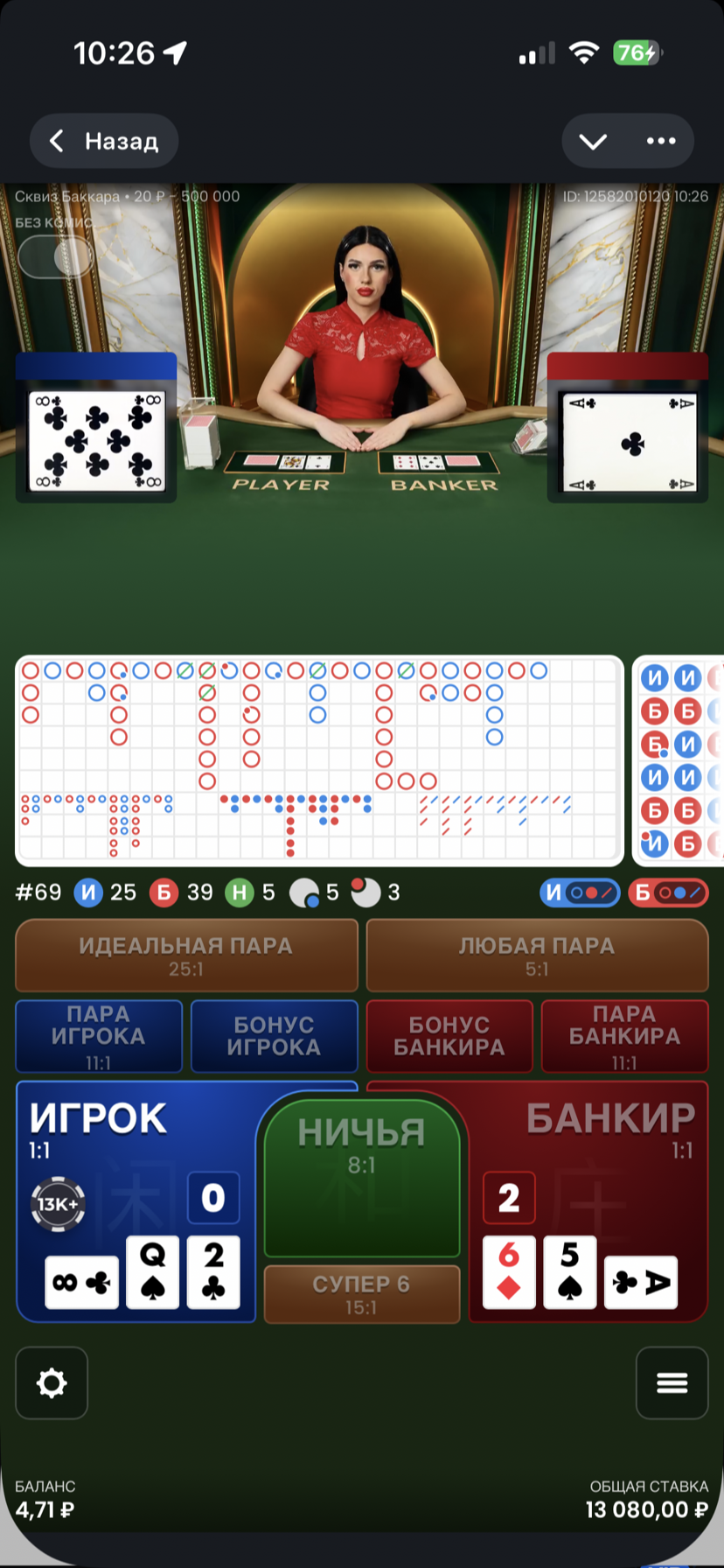 Поставил я 13000₽ на плеера. Это необычная версия баккары — баккара сквиз, где сначала можно подсмотреть, какие у кого карты, а потом уже их покажут системно. Сперва карты образовали счёт 2 у плеера и 1 у банкира. Как будто и плеер выигрывает, но следующие две карты решили всё в обратную пользу: плеер добрал себе 8 и счёт его стал 0 (баккара), а банкиру вытащили лёгенького туза, и счёт в итоге стал 0:2. Вот так моментально всё здесь меняется