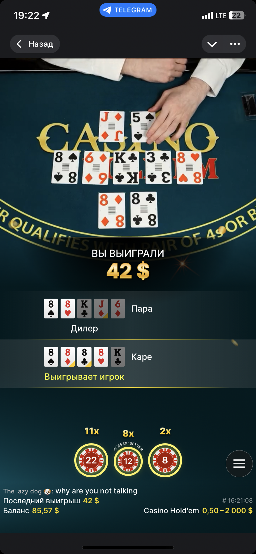 Сначала я смог поймать бонус в этой раздаче, потому что удалось поймать три восьмёрки со флопа и сразу собрть комбинацию «Тройка». Но на доборе дилер нашёл ещё одну восьмёрку, то есть все восьмёрки оказались вытащены из колоды, и у игроков сыграла выплата за Four of Kind. Если бы он вытащил четыре восьмёрки со флопа, выплата за это была бы 40:1. Но за основную руку 11х выплата тоже ничего, всё просто супер, единственное, что обидно — супер маленькая ставка именно на эту руку( Но я не жалуюсь