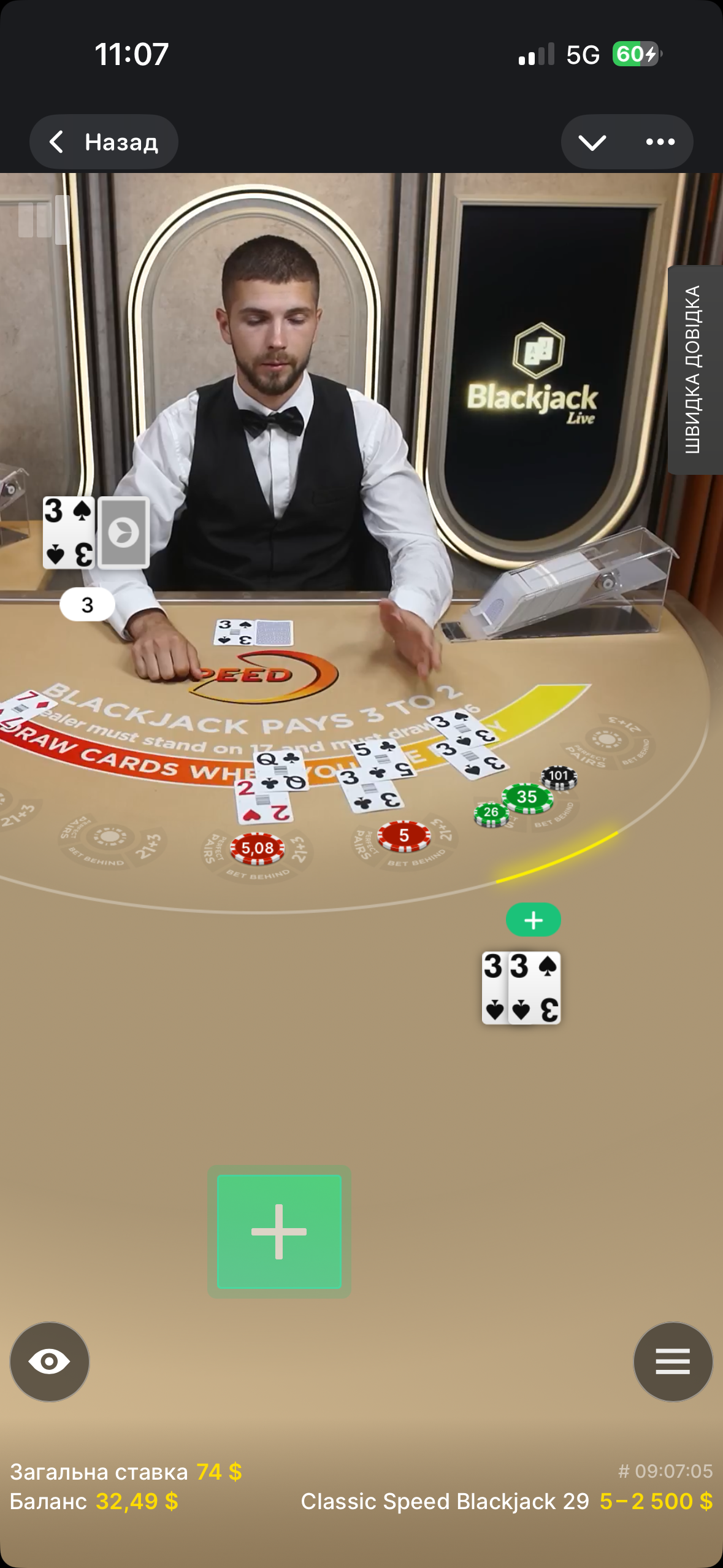 Недавно зашел в блекджек, баланс был немного, поставил буквально 35$ и по 1$ на бонусы, и тут выпадает 3 одномастных тройки, выплата 100х и 25х. Первый раз такое поймала блекджеке, никогда не думал что такое возможно.