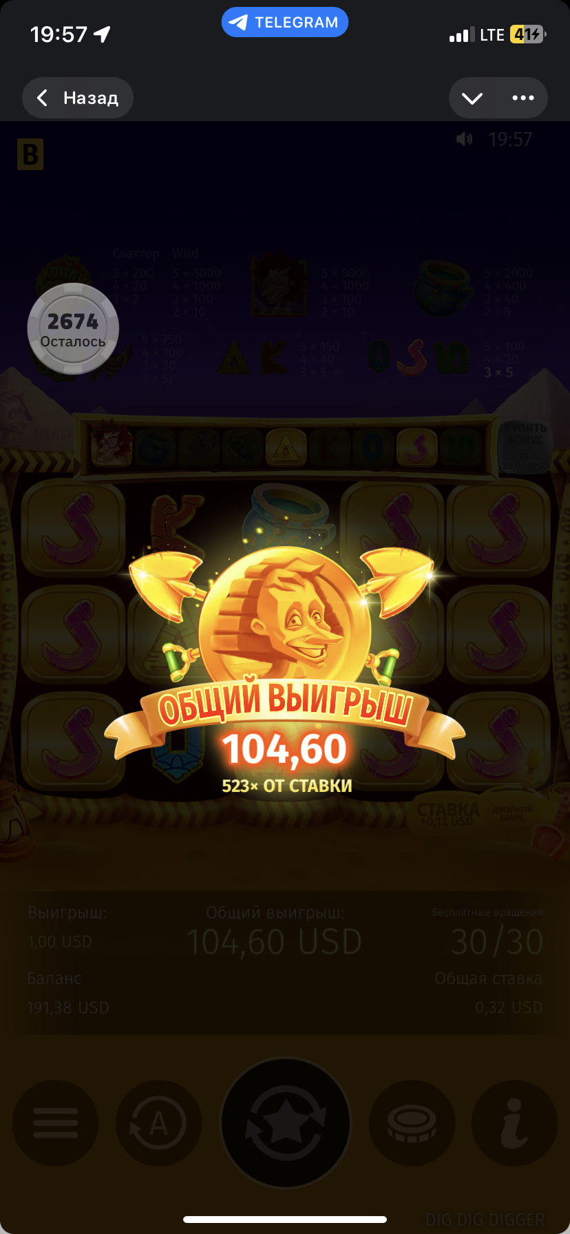 Я узнал про существование слота под названием «Dig Dig Digger» ещё аж в марте. Тогда на проекте JetTon проходил закрытый вип турнир, где по описанию слота надо было отгадать его название, и я подумал за этот слот, хотя никогда в нём не играл, просто знал механику. Вчера вдруг резко вспомнил про его существование, спустя спинов 200 поймал свою первую в этом слоте бонуску, которая дала мне больше 500х. Теперь это мой любимый Слот, мне ещё очень нравится прикольная озвучка персонажа Вадимом Галыгиным — белорусским шоуменом. Фразочки реально огонь и веселят, пока крутишь барабаны 😄