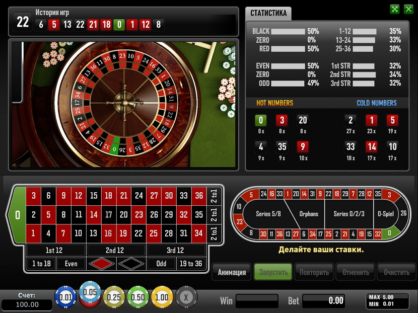Прямо над треком можно увидеть окно со статистикой игры, где доступна информация о том, насколько часто за прошлую сессию выигрывали внешние ставки и зеро, а также узнать какие из номеров являются «холодными» и «горячими». Все цифры, которые недавно выпадали, указаны над экраном рулетки рядом с надписью: «История игр». Прямо на панели управления находятся фишки различных номиналов для размещения ставок, а сбоку есть несколько кнопок надписями на русском языке.