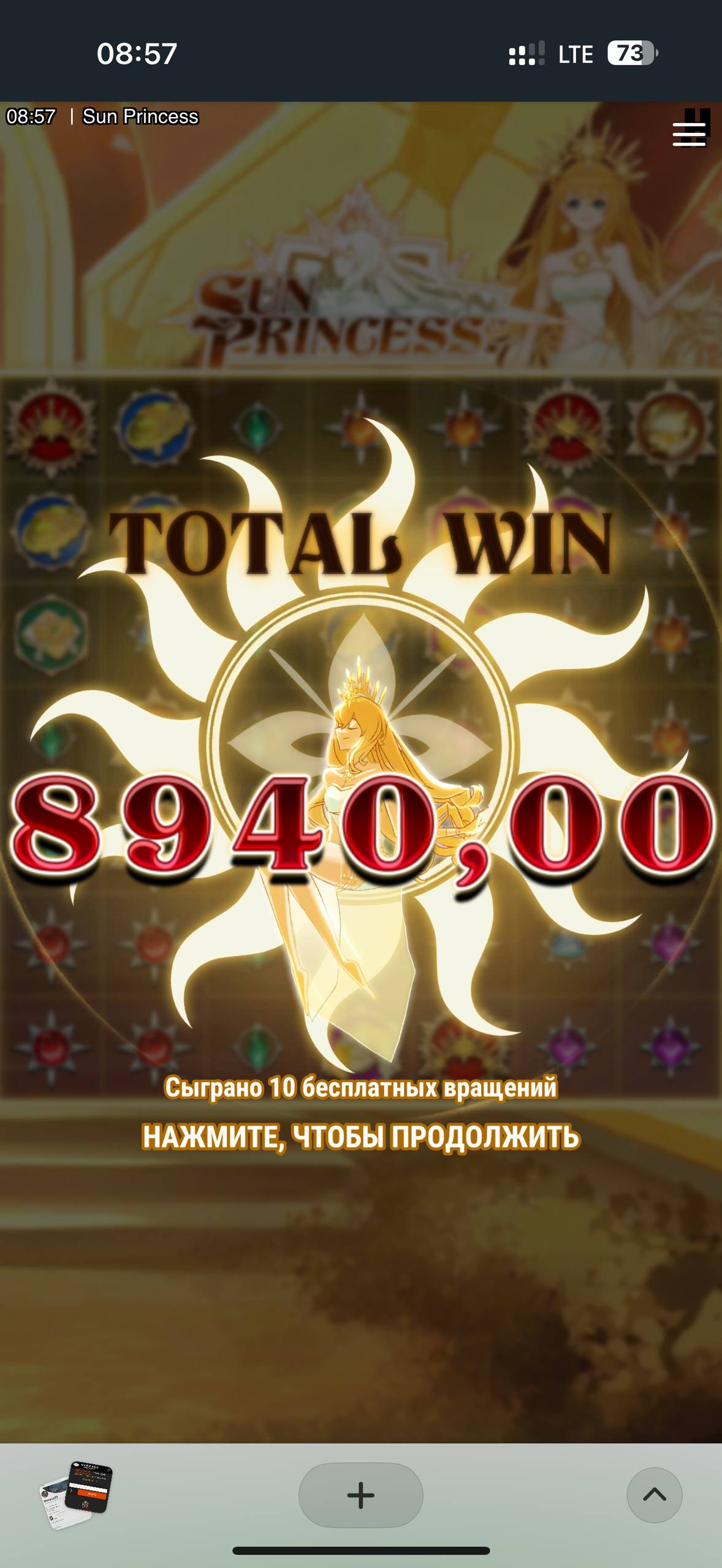 Всем привет! После двух минусовых бонусок вряд, я решил, что мне надо понизить ставки. Мой взгляд упал на сан принцесс, который мне занес в прошлой бонуске, подумал вдруг и сегодня будет занос. Купил Бонуску я за 4000, и она дала очень даже приятные почти 9000. Я снова начал улыбаться ведь богачка дала почти 450х. Всем удачи и только заносных бонусок!