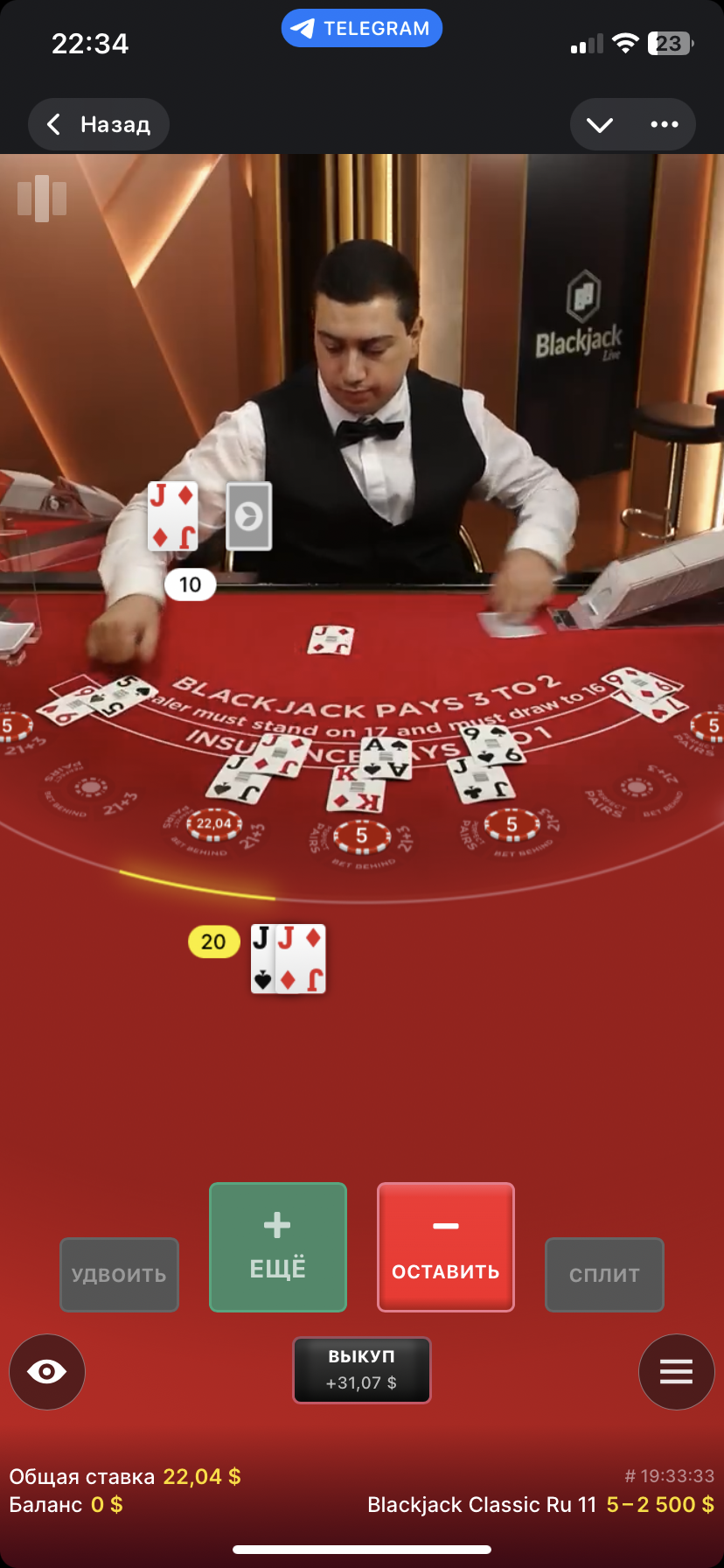 Опять мой баланс приблизился к нулю, и я люблю его возвращать по своей стратегии — алынами в блэкджеке. Зашел в классический блэкджек и сделал ставку в 22$. Дилер раздал мне два валета, и себе тоже. Такое очень редко удается словить, не говоря уже про идеальную тройку — когда все три карты одномастные и одноцветные.