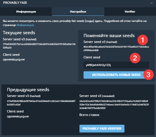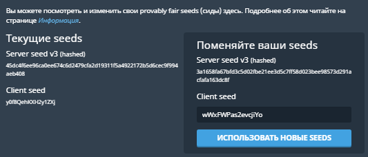 - Client seed – ряд цифр, которые задает клиент,