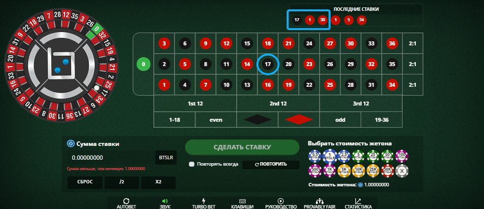 Игрок, он же автор, делает три раза ставку на 17. Выпадает: 30, 1 и – о, Боги! – 17.