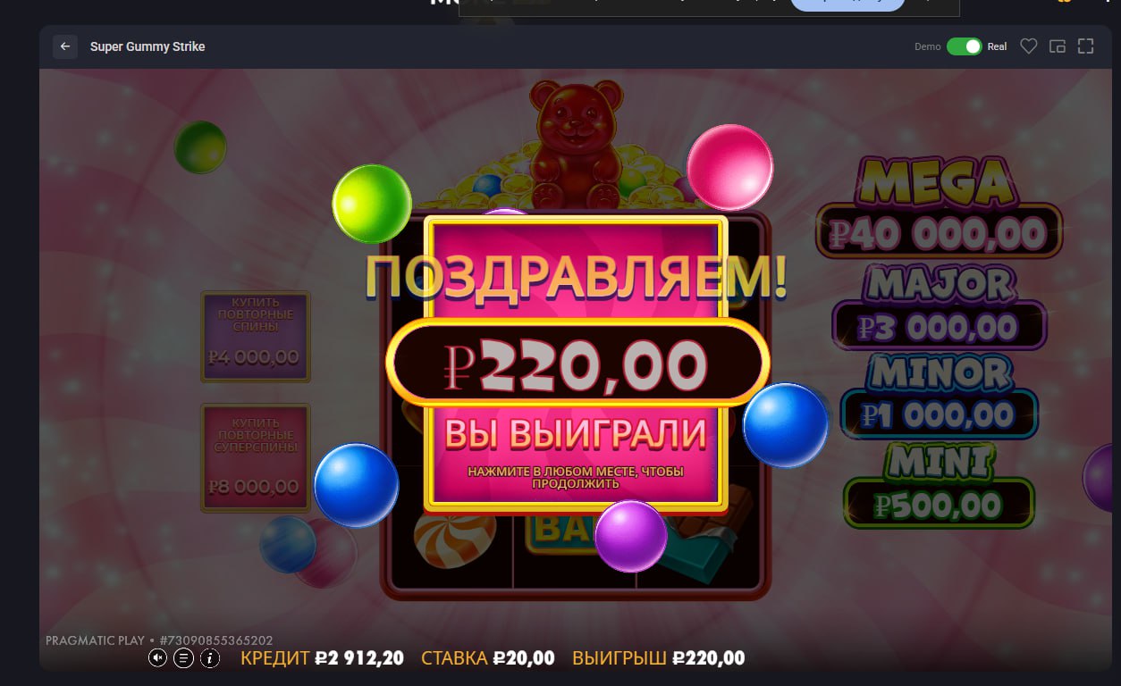 Всех приветствую, читатели моих постов и случайные лудоманы! Сегодня расскажу историю о Super Gummy Strike. Сразу скажу, что этот слот мне по нраву. Нравится техника, выбивание функции. Вот так и упала мне функция, пару раз, пару месяцев назад она давала мне 20000 рублей, сегодня же все было чуть по другому. Начал крутить по 20 рублей, надеясь, как обычно быстро выбить бонуску. Спустя 20, 30, 40 спинов функция не падал. Она упала мне +- с 70 спинов, уже просто на азарте докручивал, было огромнейшее желание выбить. Падает функция, коллектор, вижу как пролетают монетки по 20.000 рублей, 15.000, но на будущее, они так и не упали мне) При чем мишки падали часто, растили мне х, слева сверху икс был 8. Но туда вообще ничего не упало, вообще ноль монеток, даже самых дешевых. Бонуска дала всего 220 рублей( Было обидно, что впервые такой икс появился, раньше это все падало монетками. Желаю всем больших выигрышей, здравого азарта. Без лудоманства!