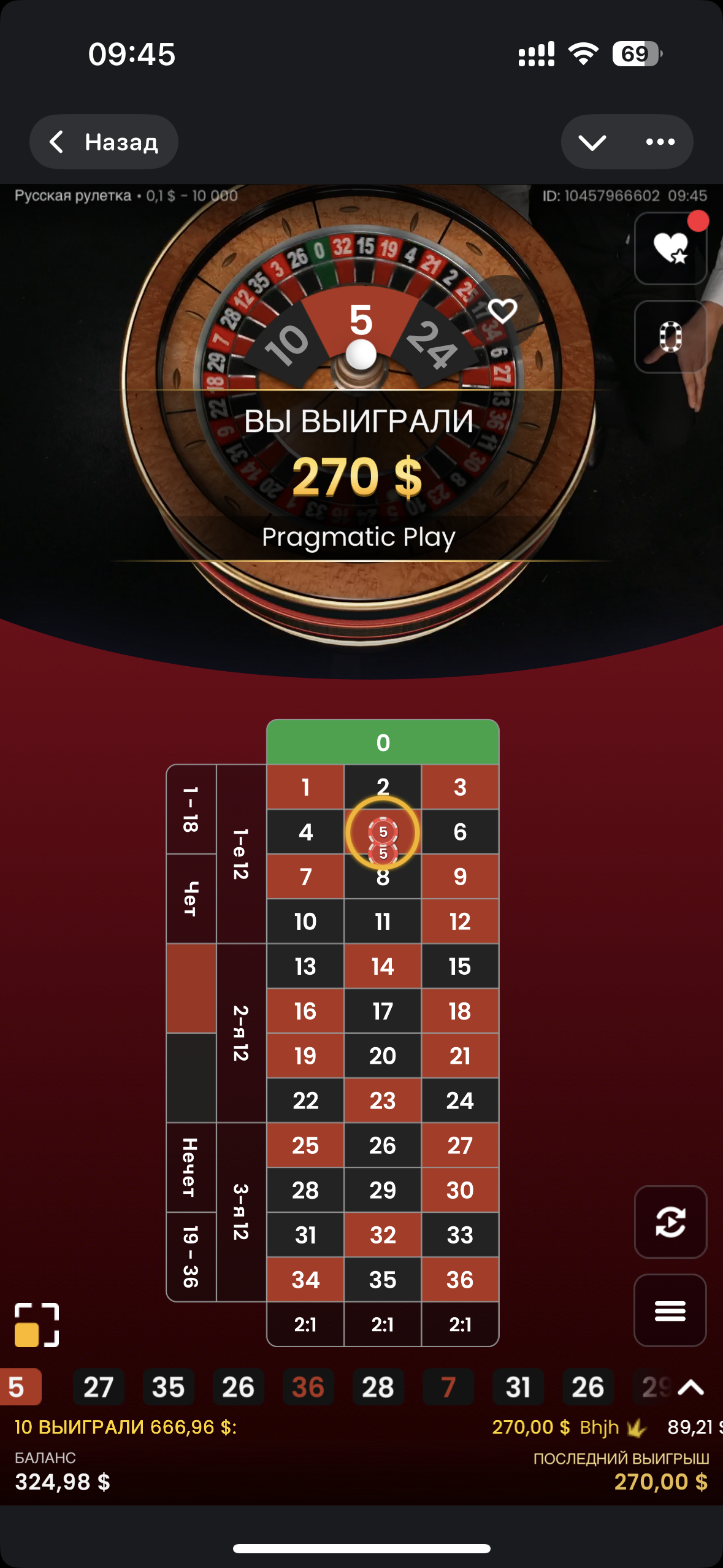 Решил поставить небольшую сумму на рулетку — чисто ради развлечения, без каких‑либо ожиданий. Первый спин — проигрыш. Второй — снова мимо. Но на третьем шаре шарик застыл на числе 5 — моём счастливом числе ещё со школьных времён.