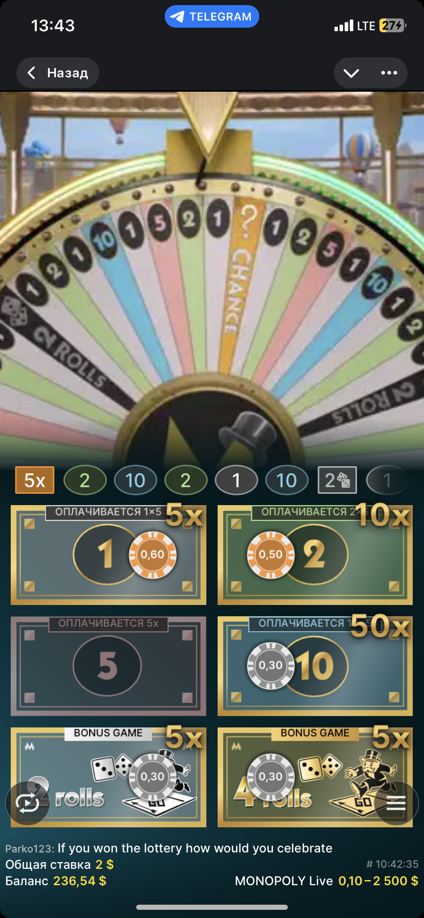 Сегодня я играл в очень старый и легендарный лайв Monopoly Live от провайдера Evolution. В нём представлено колесо фортуны с номерами и четыре с бонусными играми, а также есть два сектора «Шанс», при выпадении которых могут дать увеличенный кэшаут ставки или дополнительный спин с множителем.
