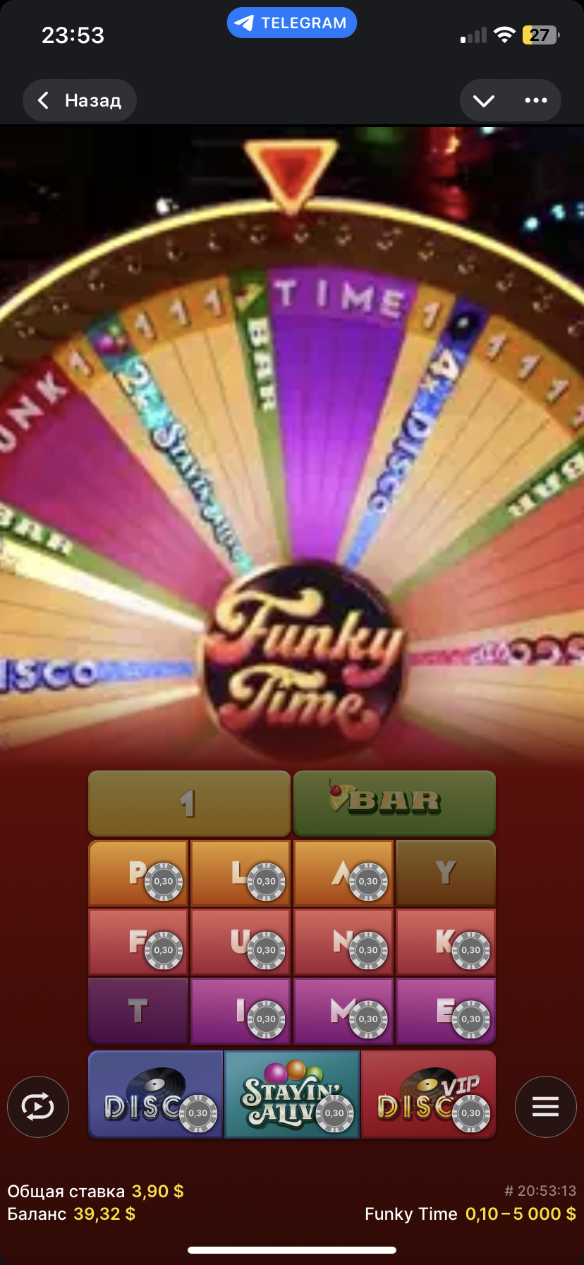Funky Time — денежное колесо от провайдера Evolution, в котором есть секторы с буквами из трёх слов (одна платит 25:1 от ставки), единичками и бонусками.