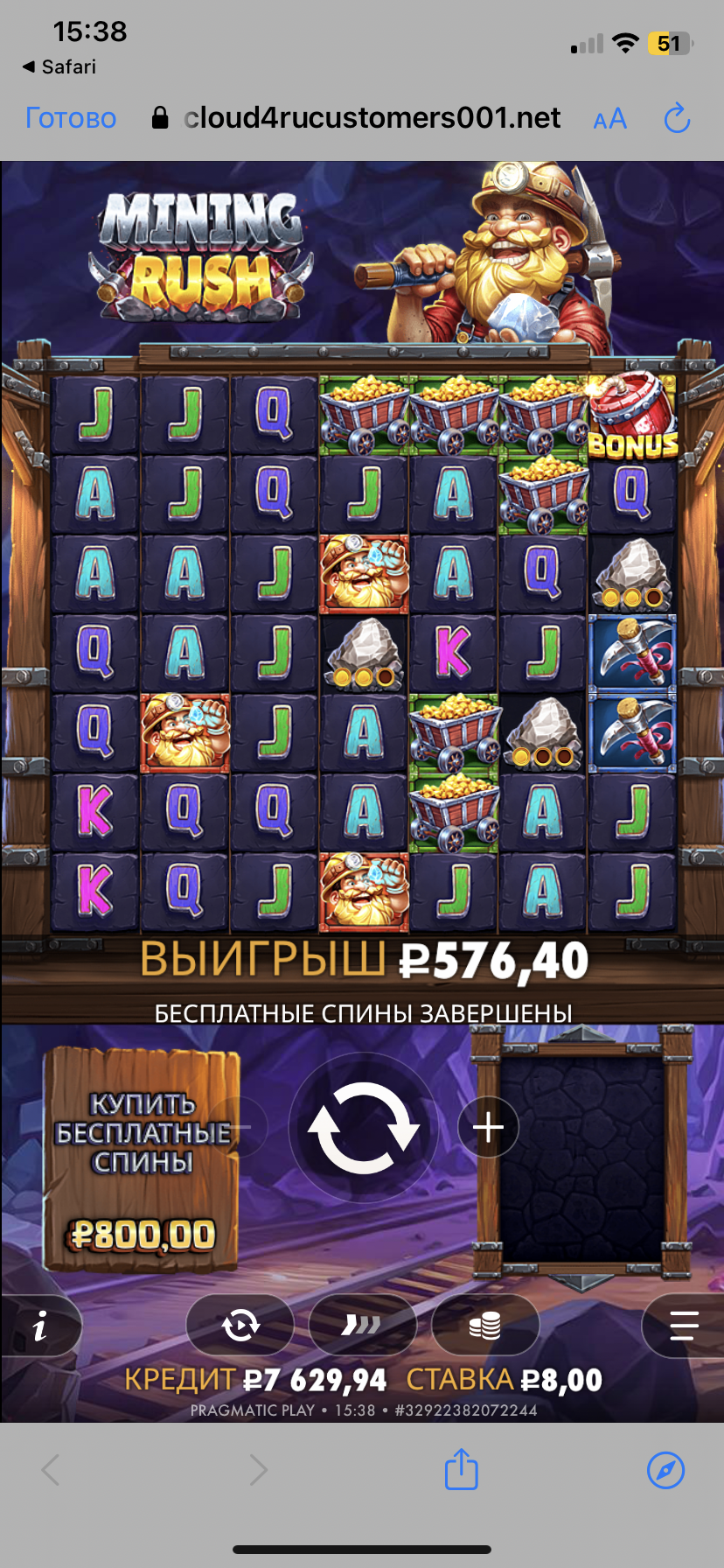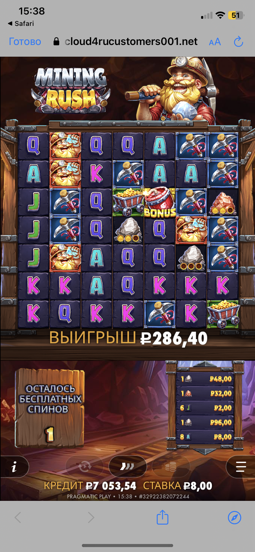 Сегодня у меня на обзоре слотик Mining Rush от Прагматика. Мне он нравится, потому что получалось уже в нём заносить, но он такой вредина бывает, когда показывает скаттеры, но сыгровок нет, а если они есть — даёт дополнительные спины. Решил купить несколько бонусок за х100 от ставки, и ни одного скаттера даже не было за все бонуски, показались только в двух разных. Однако, чтобы сработал ретриггер, как я и сказал выше — вместе со скаттером нужна хоть одна сыгровка. Забайтил знатно так