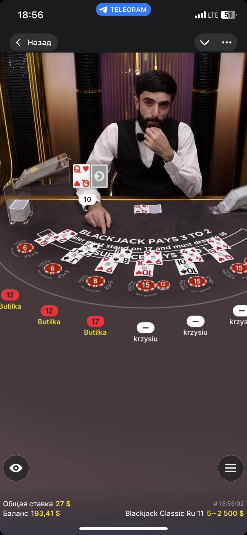 Я присоединился за русский стол в блэкджек, за ним в три руки сидел только один игрок. Я решил тоже сесть в три руки левее, чтобы сначала карты шли ему, а потом мне, потому что идеи как «очистить» свою удачу уже кончаются.