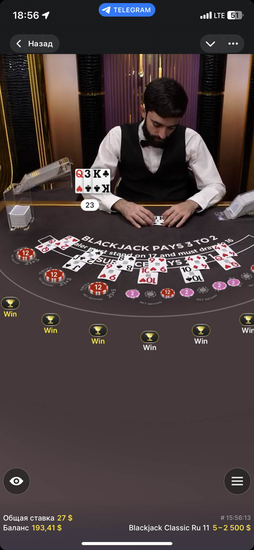 Ну, всё как всегда — 10 у дилера и отвратительные карты у нас: на каждой руке кривой счёт, и любой добор может стать «смертельным». Сосед остановился на всех своих трёх боксах, я решил повторить за ним, вспомнив такой недавний опыт в прошлом. Закрытой картой у дилера была 3, и опять тактика сработала — он вытащил десятку, которая в любой бы нашей руке привела к поражению, но благодаря этому общему, правильному решению — везде победы. Вот реально, всегда бы так.