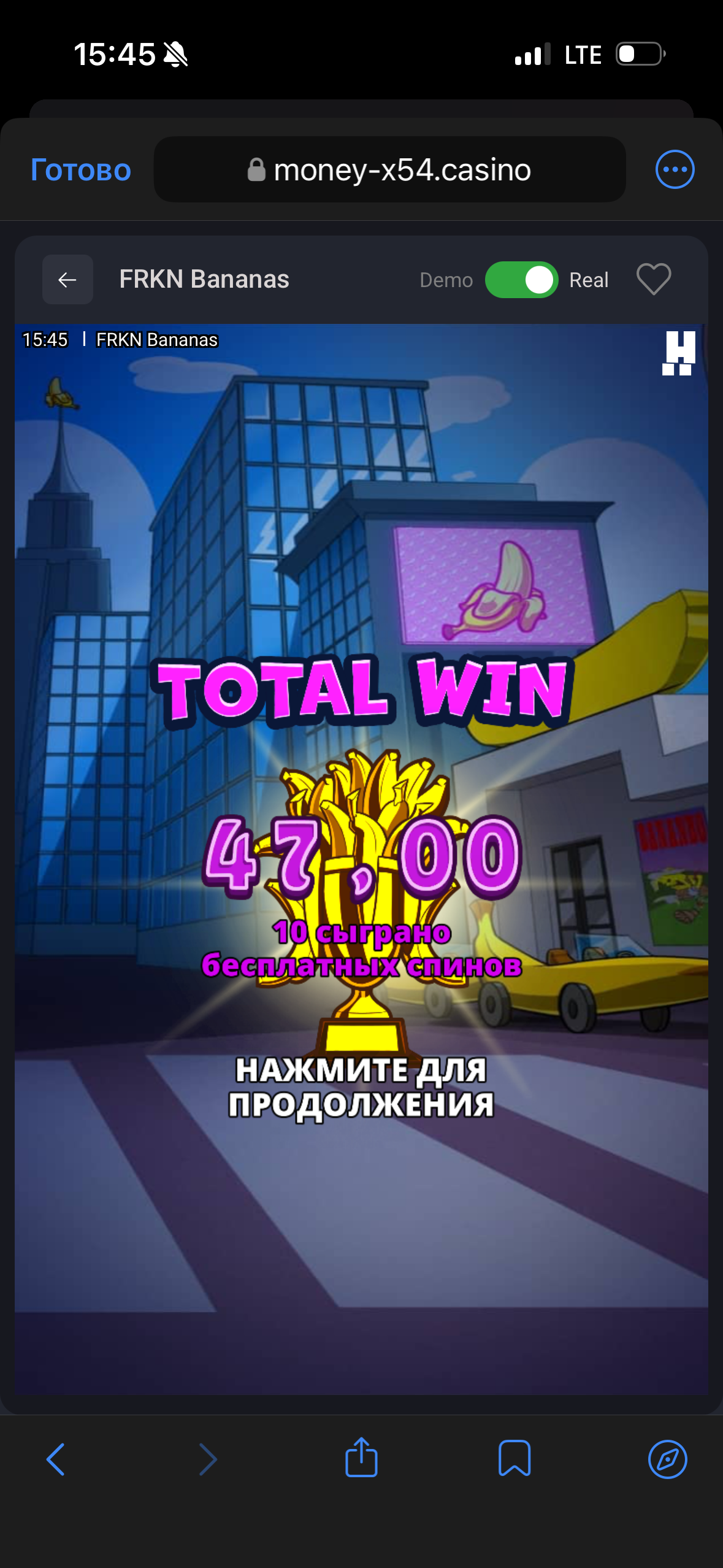 Всех категорически приветствую , всегда когда мы играем с другом в казик , по традиции заходим в слот который мой друг прозвал «ле бананы» и всю жизнь сидели с мыслями что там минималка которую он отдает это 10х , и думали пока не отдало 10х еще есть шанс на занос, какого же было наше удивление когда я увидел выигрыш 44 рубля.