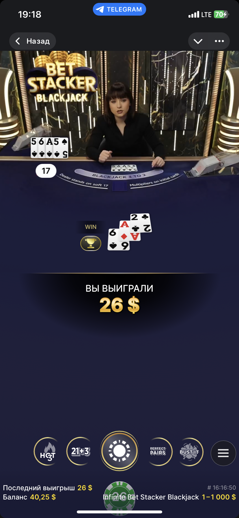 И так, у дилерши 5, а у нас со всеми игроками — 6 и туз. Мягкая 17, нормальный счёт, большинство выберут стоп, ведь следующая карта выше 4 может испортить счёт и значительно понизить его. Все так и сделали, кроме меня и ещё одного игрока, которые выбрали хит. И не зря — следующая карта 2, и у нас двоих счёт стал 19. А дилерша в итоге собрала себе 17, и все, кто остановился и не добирал — ушли в ничью, и только мы двое победили.