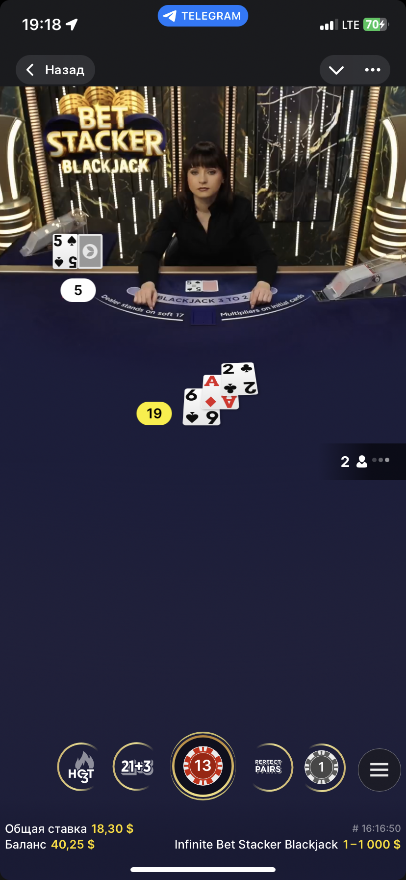 Решил поиграть в infinite Bet Stacker Blackjack — коле не везёт за общими столами для нескольких игроков, буду играть со всеми в одну руку.