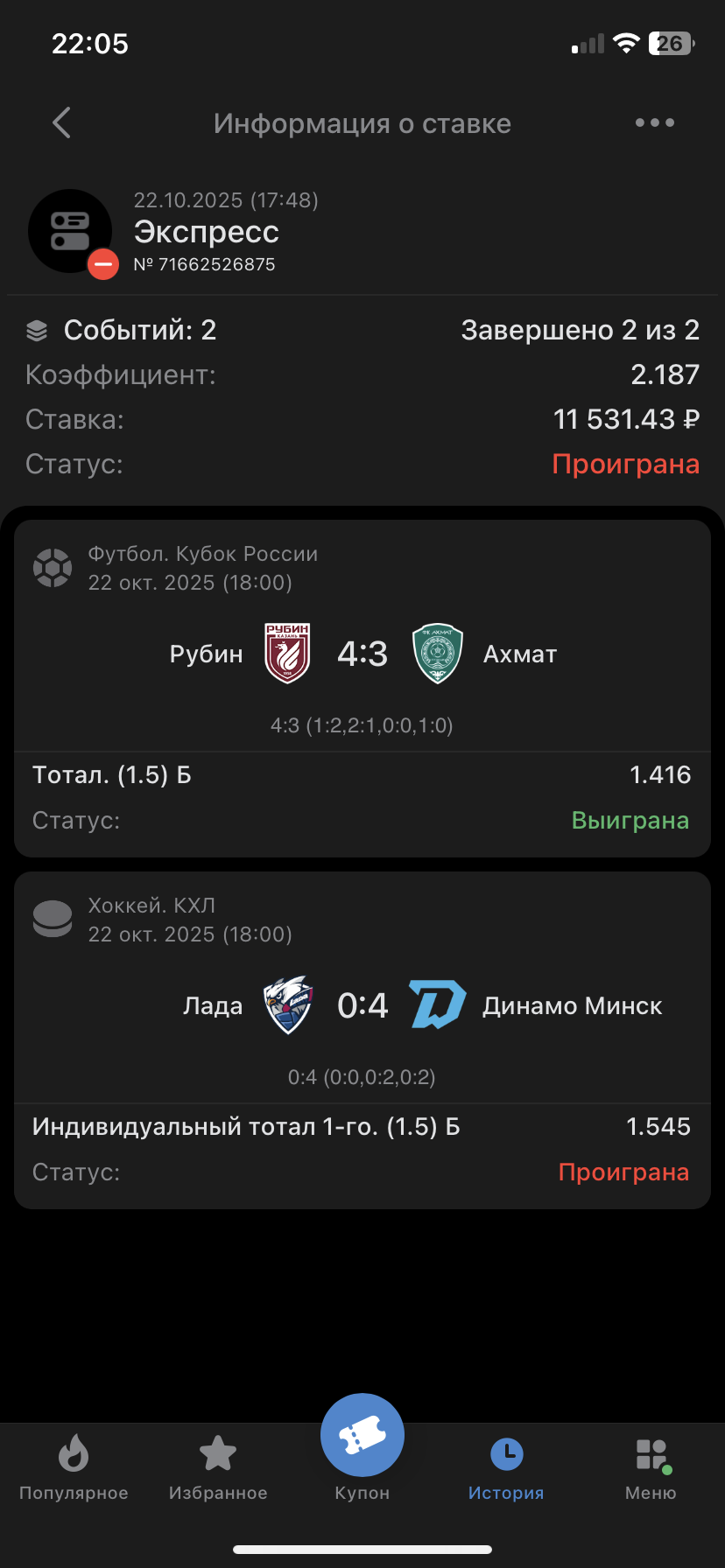 Оставался тильт после вчерашнего экспресса, в котором не хватило всего одной забитой шайбы для крупного выигрыша, поэтому я решил его себе увеличить и поставил 11 500 рублей на вот такой двойник: