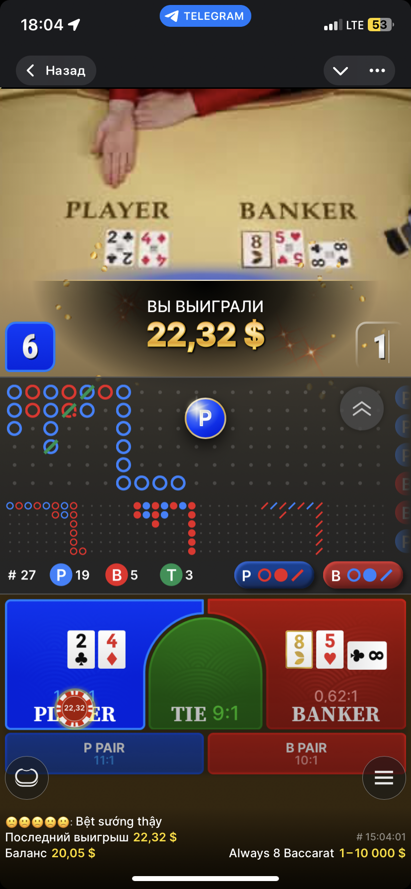 Always 8 Baccarat — очень интересная для меня разновидность популярной игры Baccarat, в которой у банкира в начале игры первая квота всегда 8. Однако плееру сбрасывается две карты подряд, в банкиру уже третью за ними из колоды. Как вы понимаете, игрок здесь имеет гораздо меньше шансов выиграть в любом раунде, ведь в 90% случаев банкиру достаточно комбинации перманентной 8 и любой десятки, соответственно выплата за победу плеера составляет 1:48:1. Я впервые увидел, как он выиграл невероятных 10 раундов подряд, ведь обычно в этой игре доминирует именно банкир.