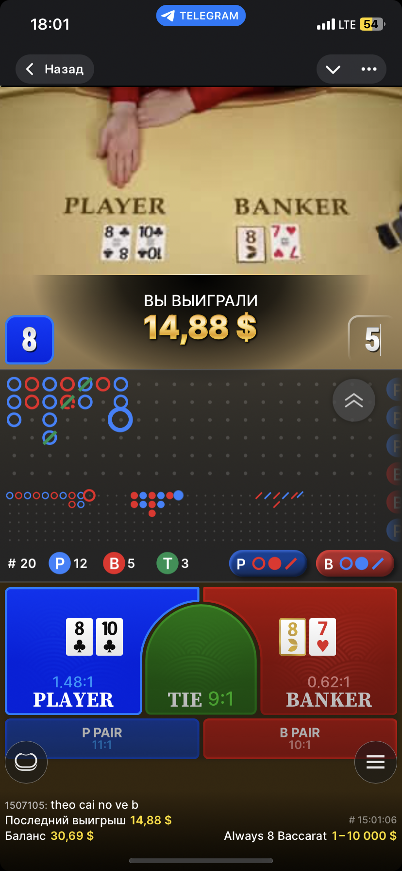 Сумасшедший трейд на плеера в Always 8 Baccarat