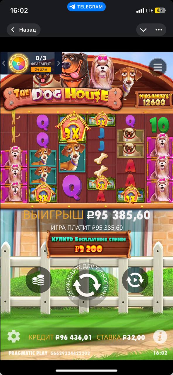 Когда я их открутил, как обычно зашёл в слот The Dog House Megaways, в котором всегда откручиваю эти бонусные деньги. Я ожидал, что как обычно съест баланс и на этом всё, но внезапно слот поставил офигенную линию из розовых собак и будок, и общий икс всего за спин получился дольше 3000х.