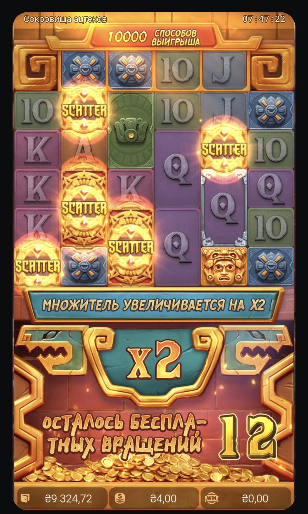 Один из слотов, который может хорошо наиграть, это сокровище ацтеков, часто там отыгрываюсь и по волатильности приятно играть. В этот раз выбила бонуску со спина и не зря, говорят, если словить весь ряд, может на максвин сыгровок поставить. Но пока словила только 300х, что тоже приятно, но последние 4 спина просто не доставляли символы, как будто тумблер сработал больше не давать((