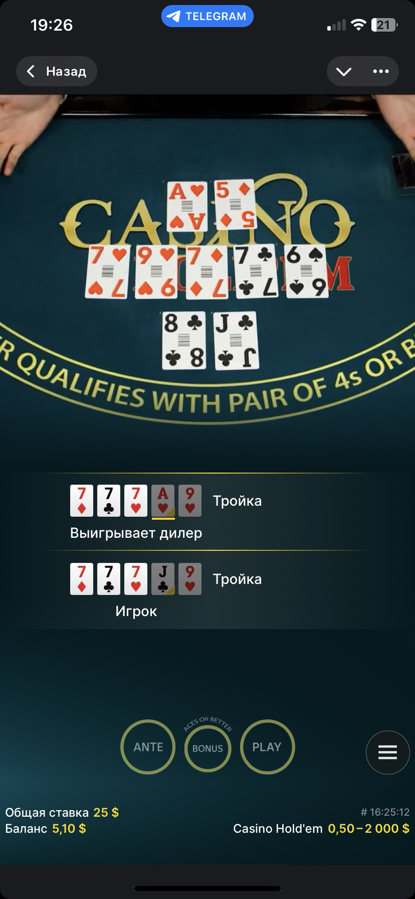 В покере на общем борде оказалось три семёрки, прямо таки Lucky Streak 7-7-7. Теперь всё зависит от карт, у кого их значение выше — у дилера, или у игрока. Теперь играют Тройка против Тройки. У нас был валет и 8, а у дилера оказались туз и 5. Эх, не судьба: Туз старше Вальта. В этот раз удача явно на дилерских картах