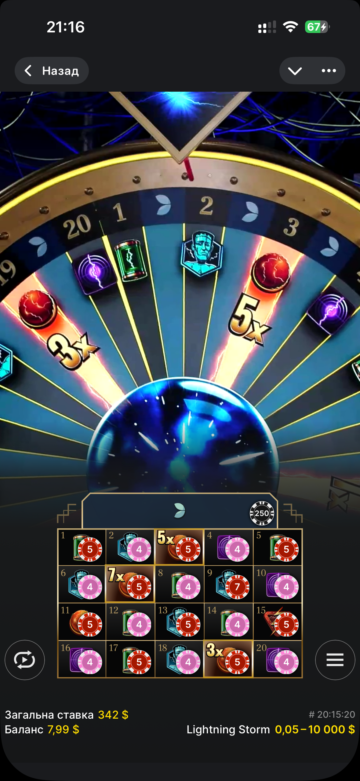 Недавно играл на джетоне, и поднял с фс 400$, хотел добить 500 и вывести, но начало сливать. Когда баланс стал 350$, я решил жестко рискнуть, и поставит алын в лайтнинг шторме, 250$ на листочек, и по 4-5$ на бонуски. Колесо начало останавливаться возле фаер бола под 5х, и я понимал, что если даст его, то в любом случае это должен быть окуп ставки. Но оно не остановилось, и я надеялся, что уже хоть на листочке остановится, но оно перекатило к худшей бонуске с возможных. Но в итоге дало 24х.