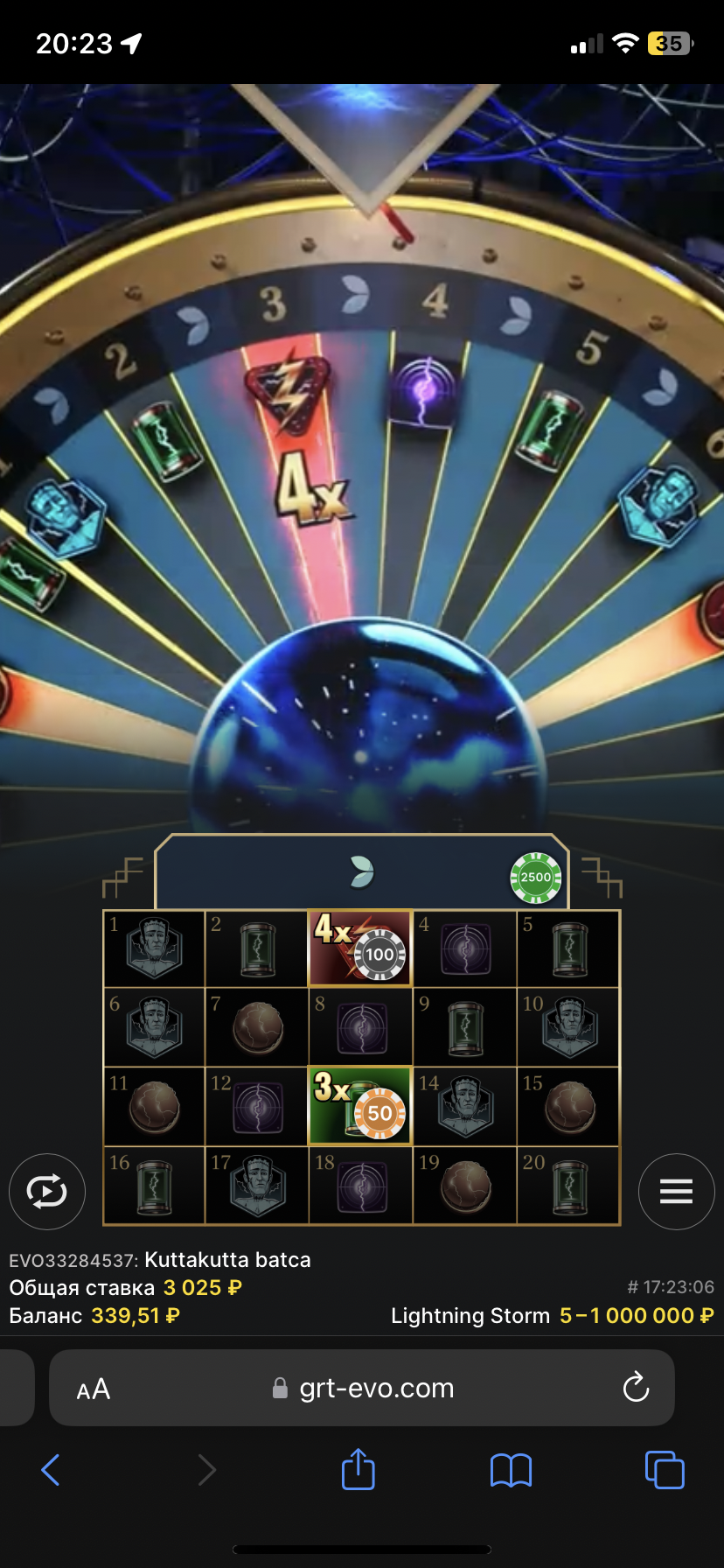В спине выпал топ слот 4х на топовый красный бонус Lightning Storm под числом 3, но в итоге колесо остановилось на бонуске под числом 4 близ трёх выигрышных секторов.