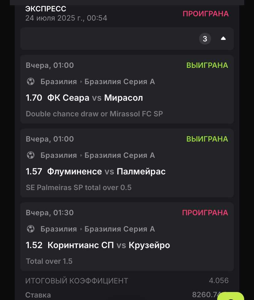 Зогласен РАСКЛАД(( В игре к сожалению и такое бывает, и не только на ставках на спорт. Значит это просто был не твой день)
