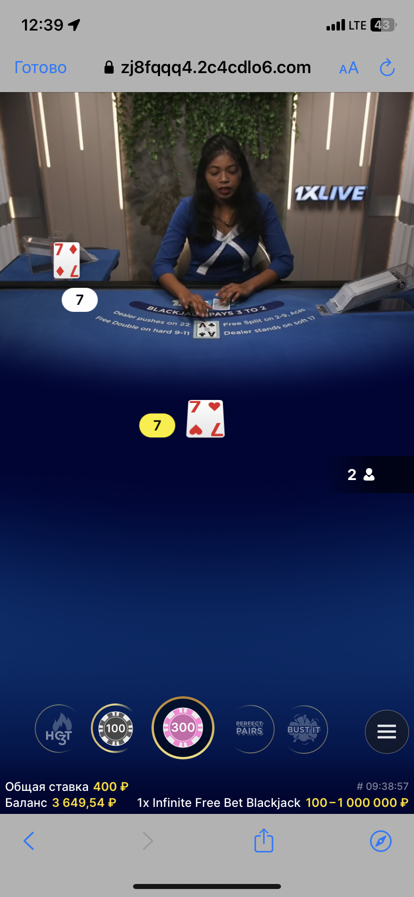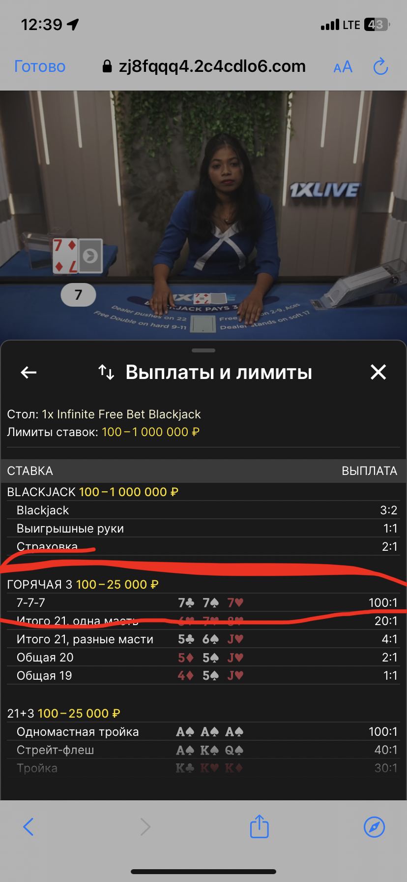 7-7-7 – такая комбинация в некоторых видах Блэкджека, за которую присуждается выплата 100:1 к бонусной ставке, причём неважно, какие масти у карт. Например, такое есть в infinite free bet blackjack, в который я играл. Зашёл на одну ставку, в итоге мне 7, дилерше тоже 7… ну вот оно, дай мне ещё одну 7 и я улечу! Но нет, третьей картой был туз… А ведь было так близко!