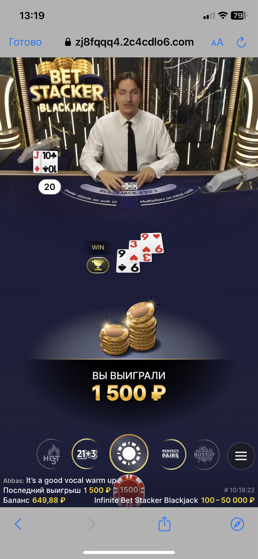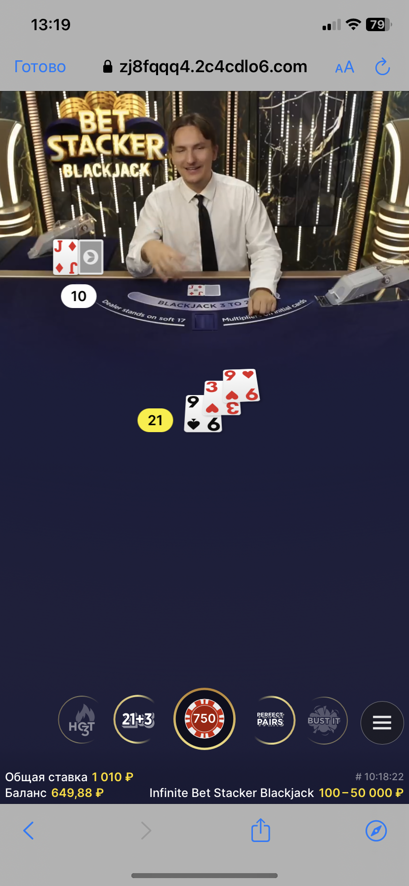 Я играл в infinite free bet blackjack. В этом режиме для всех игроков карты одинаковые — мы все играем в одну руку. И вот, дилер раздал нам 12, а себе — 10. Ненавижу счёт 12, ведь как тяжело добрать на нём и не перебрать, будь следующая карта десятка… Но я и пара-тройка игроков всё-таки решились на этот роковой хит, и нам очень повезло — счастливая девятка обеспечила нам счёт 21, а у дилера в итоге было 20. Те, кто остановились на 12 — проиграли в любом случае, надеясь на перебор у дилера, поэтому в таких ситуациях, я считаю, единственный правильный выбор в такой ситуации — это добирать карту.