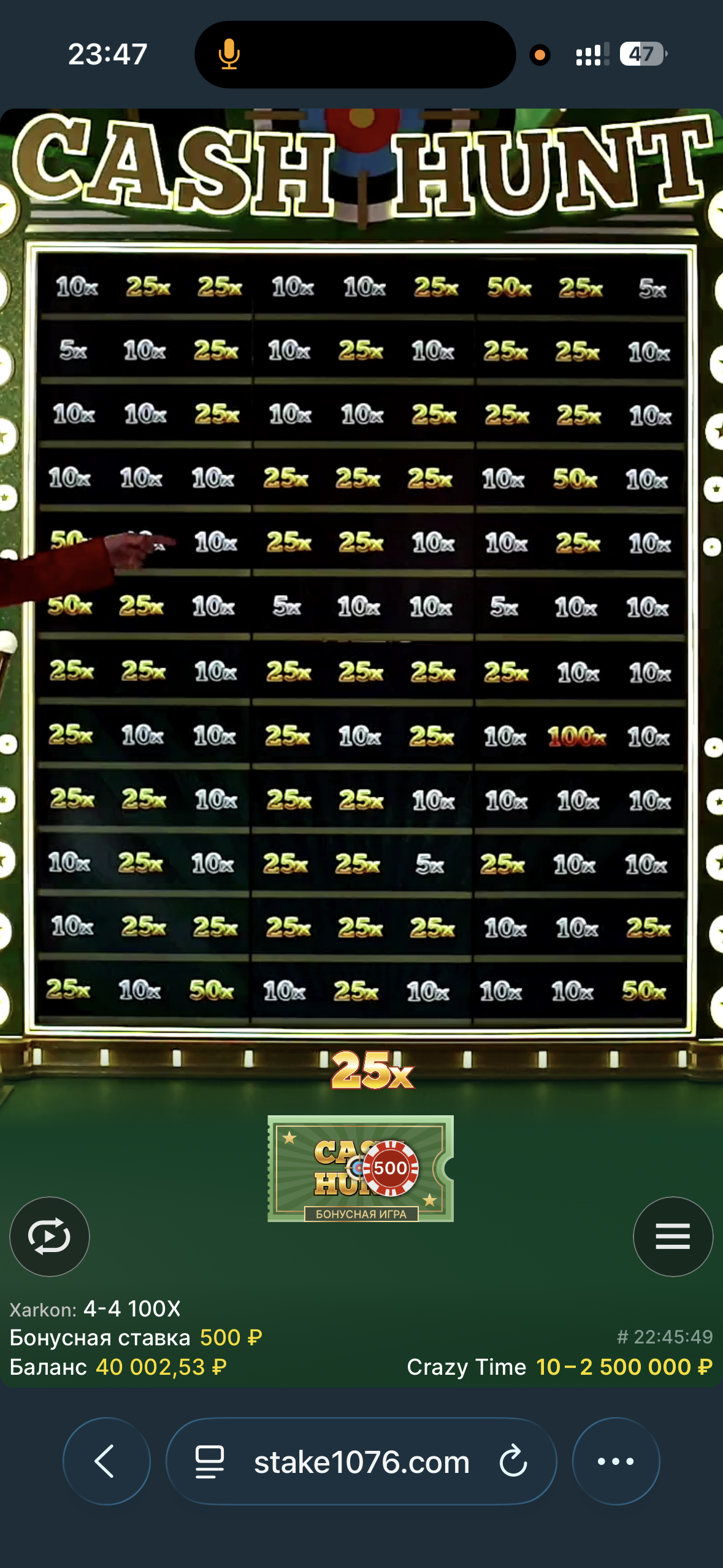 Стейк. Депозит 30к рублей, до этого было слито еще 30к. Я решил пойти сразу в лайвы, просто чтобы комбекнуть. Играл в крейзи тайм, ставил чисто на 1 и 10, иногда еще докидывал на бонуски. И вот я поставил большую ставку на 1, и по 500р на бонуски. Выпал кеш хант, по ставке 500р, это самая большая ставка по которой я ловил, я надеялся поймать 100х, чтобы вывести сразу. Но повезло поймать только 25х, но даже так это был плюс со ставки