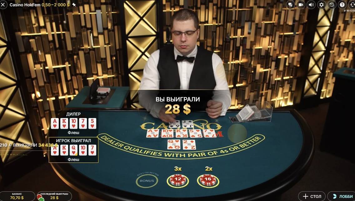Я играл в Casino Holdem от провайдера Evolution на проекте JetTon. Была просто обычная сессия, иногда дилер выигрывает, иногда выигрываю я.